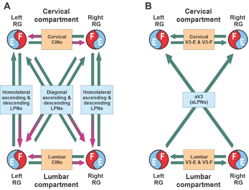 ラットの実験では、V3 aLPN(V3a長固有脊髄ニューロン)がトロット(速歩)に必要な斜め前と斜め後ろのRGの同期を促進することがわかっており[6]、四肢(前肢後肢もしくは上肢下肢)間の協調的な動きは神経学的な機構によって作られていることがわかります。